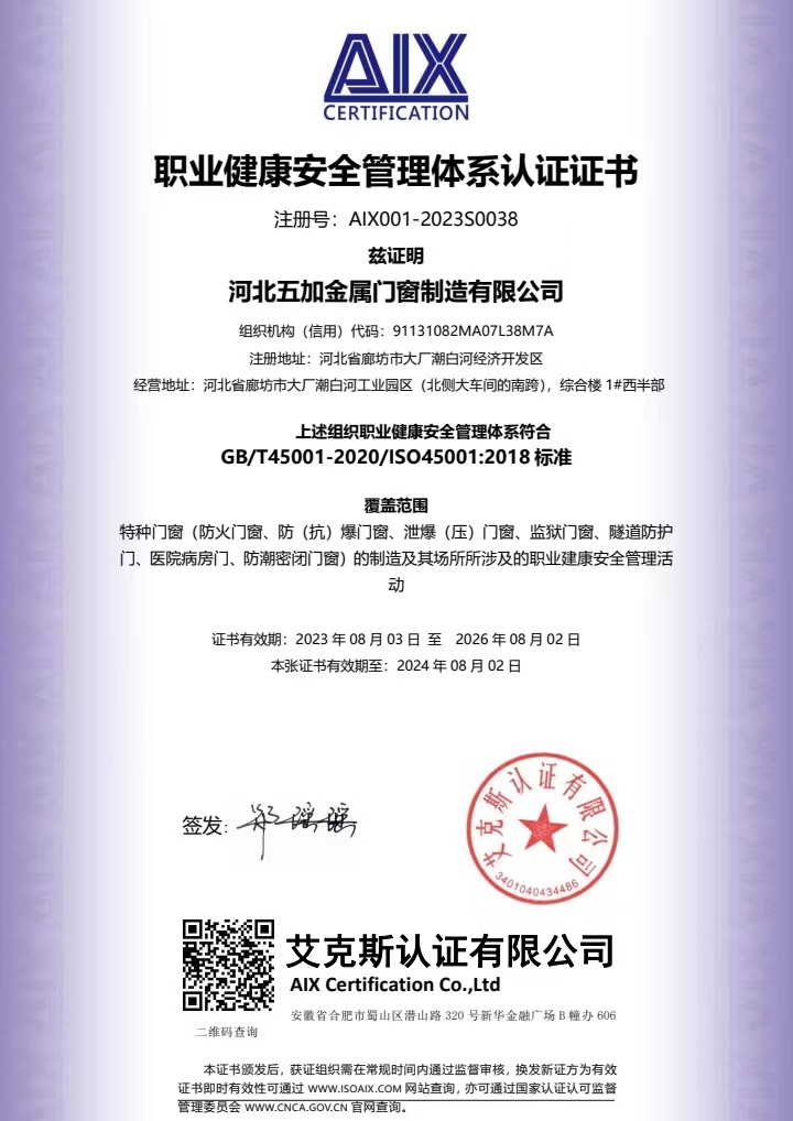 职业健康安全管理体系认证证书